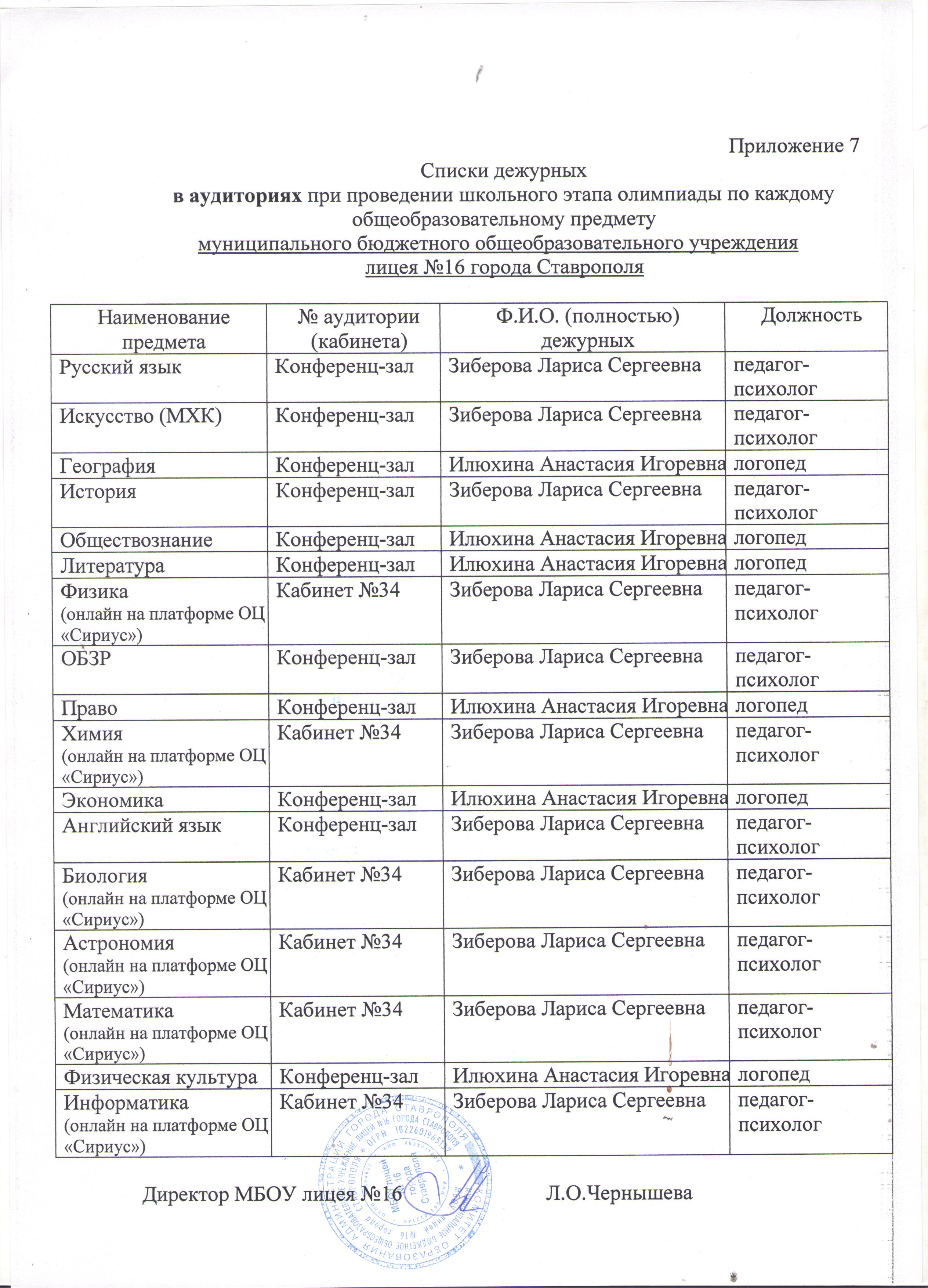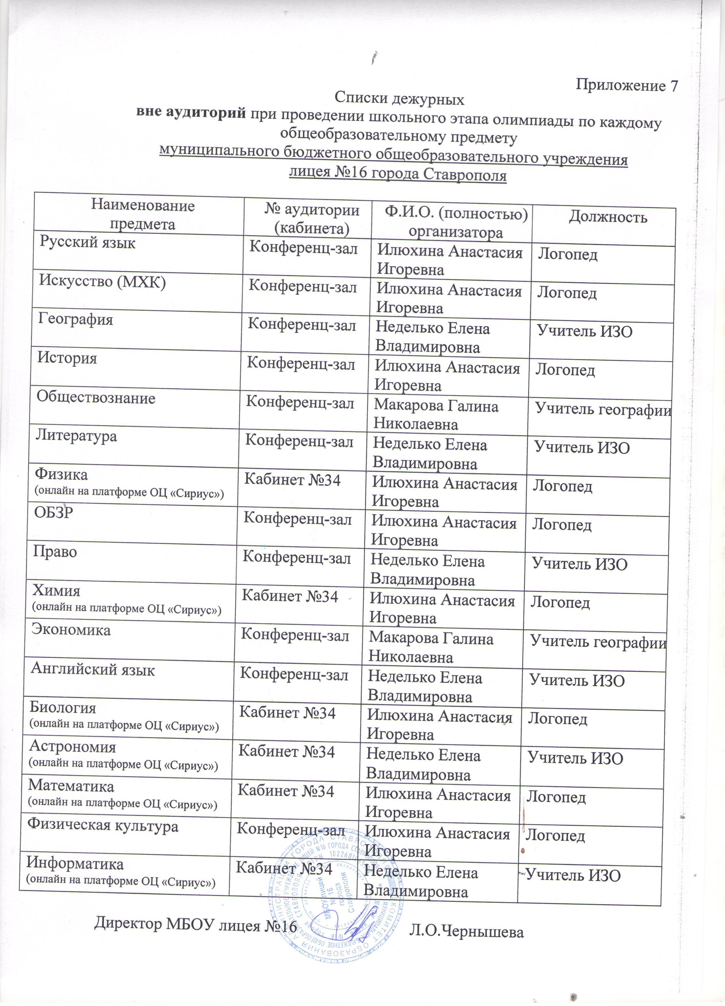 Состав дежурных в аудиториях проведения школьного этапа ВсОШ по каждому предмету
